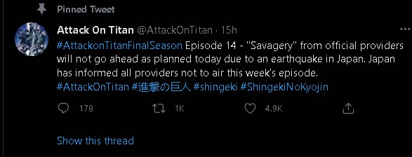 După cum se știe prea bine, ieri, 14.03.2021 ar fi trebuit să apară episodul 14 din al patrulea sezon Attack on Titan. Din păcate, datorită unui cutremur în Japonia, episodul va întârzia să apară.