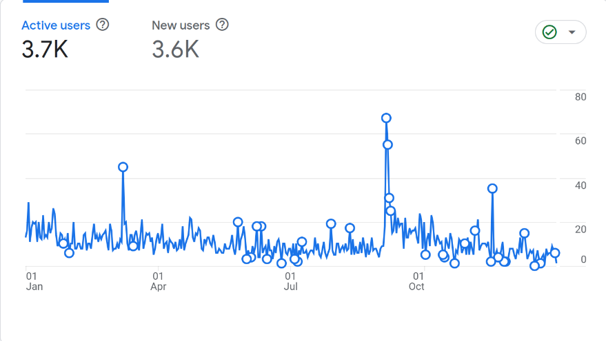 Am învățat să folosesc mizeria asta de Google Analytics și aparent, utilizatorii unici sunt cei de la ”Active users”. Dacă vă aduceți aminte, în 2023 i-am luat pe cei de la ”Returning users”. Aparent, am 3700 de utilizatori unici pe an, iar pe 5 septembrie am avut un spike de 67 de utilizatori unici.