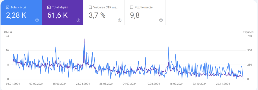 În 2023 am avut 3,54K click-uri și 109k impresii. Deci, o scădere și aici, dar e de la sine înțeles, nu s-a scris atât de mult și nici consecvenți n-am fost.